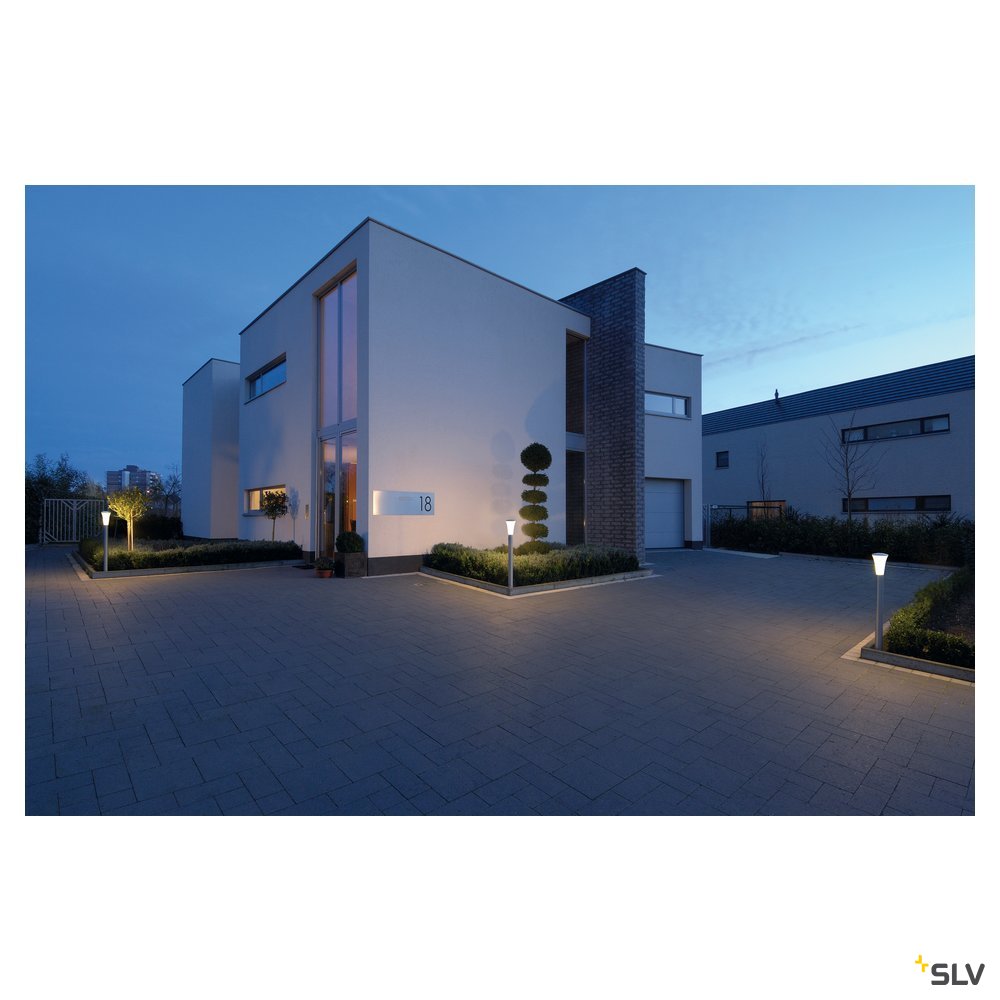The aluminium-made floor stand of the ALPHA CONE 100 emits its light via one opalescent lamp head made from PC. With protection class IP55, it is suitable for outdoor use. As optional accessories for the colour and size versions available, we offer suitable earth spikes, concrete anchor sets, hanger bolt sets and a connection box for safe electrical connection within the round bollard. Connection is made to the 230V mains voltage.