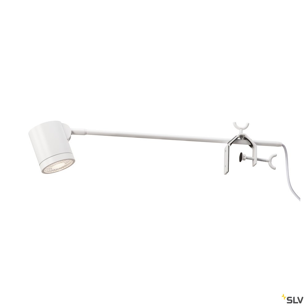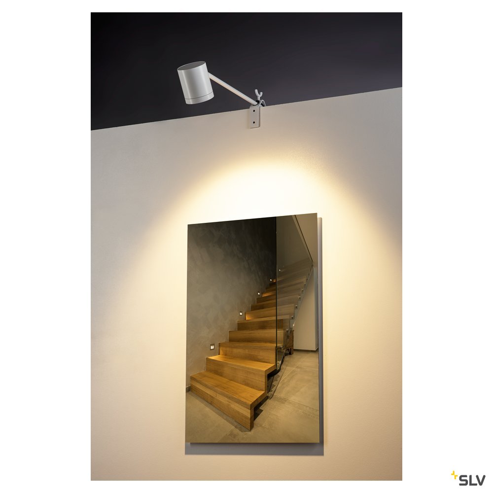 Adjustable high-voltage display luminaire ANELA LED, with clamp and lamp head connected to a rigid and straight rod. The ANELA can be used for individual modern accent lighting due to the built-in premium LED. The electrical connection of the luminaire is made by plugging the connection lead with mains plug directly into the 230V mains supply.