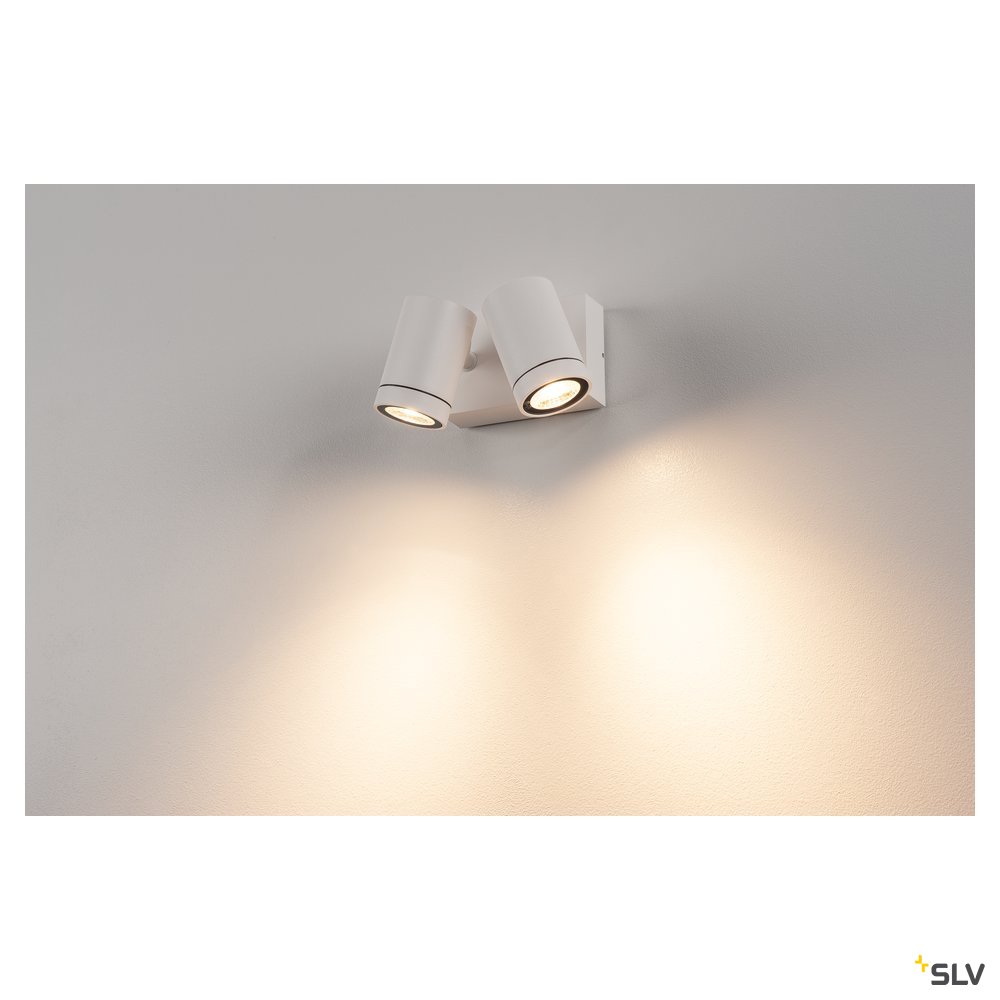 The puristic HELIA wall light consists of a cylindrical aluminium structure and it fitted with two warm-white high-voltage LEDs. The electrical connection of the luminaire, which comes in white, beige or anthracite, is made directly to the 230V mains supply. With protection class IP55, the floodlight is suitable for outdoor use. This luminaire contains dimmable LED lamps. The lamps in the luminaire cannot be replaced. The HELIA series contains further pendants, wall lights, display lights, path lights and floor stands, and as such can be used universally.