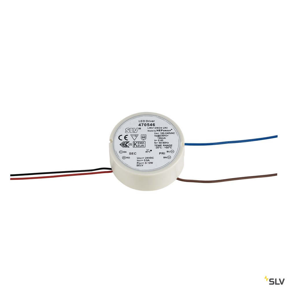 LED power supply providing 24V constant current and a maximum output power of 12W. It is already equipped with 12.5 cm primary lead and 14.5cm secondary lead. Thanks to its construction, it is suitable for installation in switch or conduit boxes measuring 60 mm in diameter.