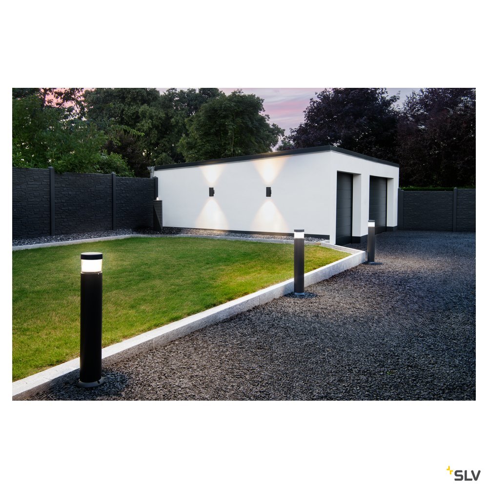 The puristic/slim design of the POLE PARC UP/DOWN wall light has a wide range of application areas. The luminaire has a cylindrical aluminium design, and is equipped with two warm-white, high-performance COB LEDs. Because of the built-in LED driver, the electrical connection of the luminaire, which is available in anthracite, is made directly to the 230V mains supply. This luminaire contains built-in LED lamps.